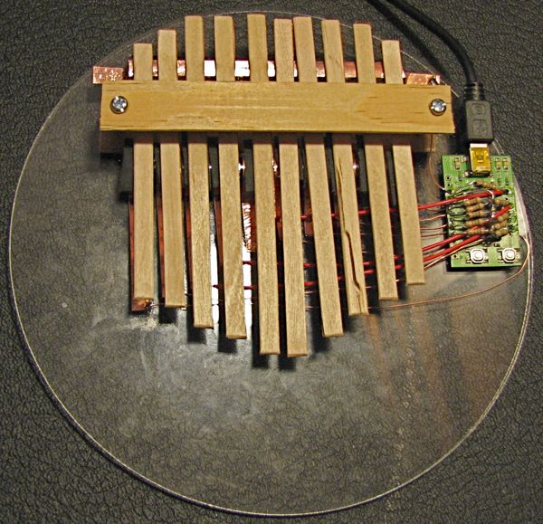 This simple controller is inspired by the south African kalimba. The kalimba lends itself to rapid assembly because of its use of a single central bar held down by two screws to trap the array of tines between two pivot points.